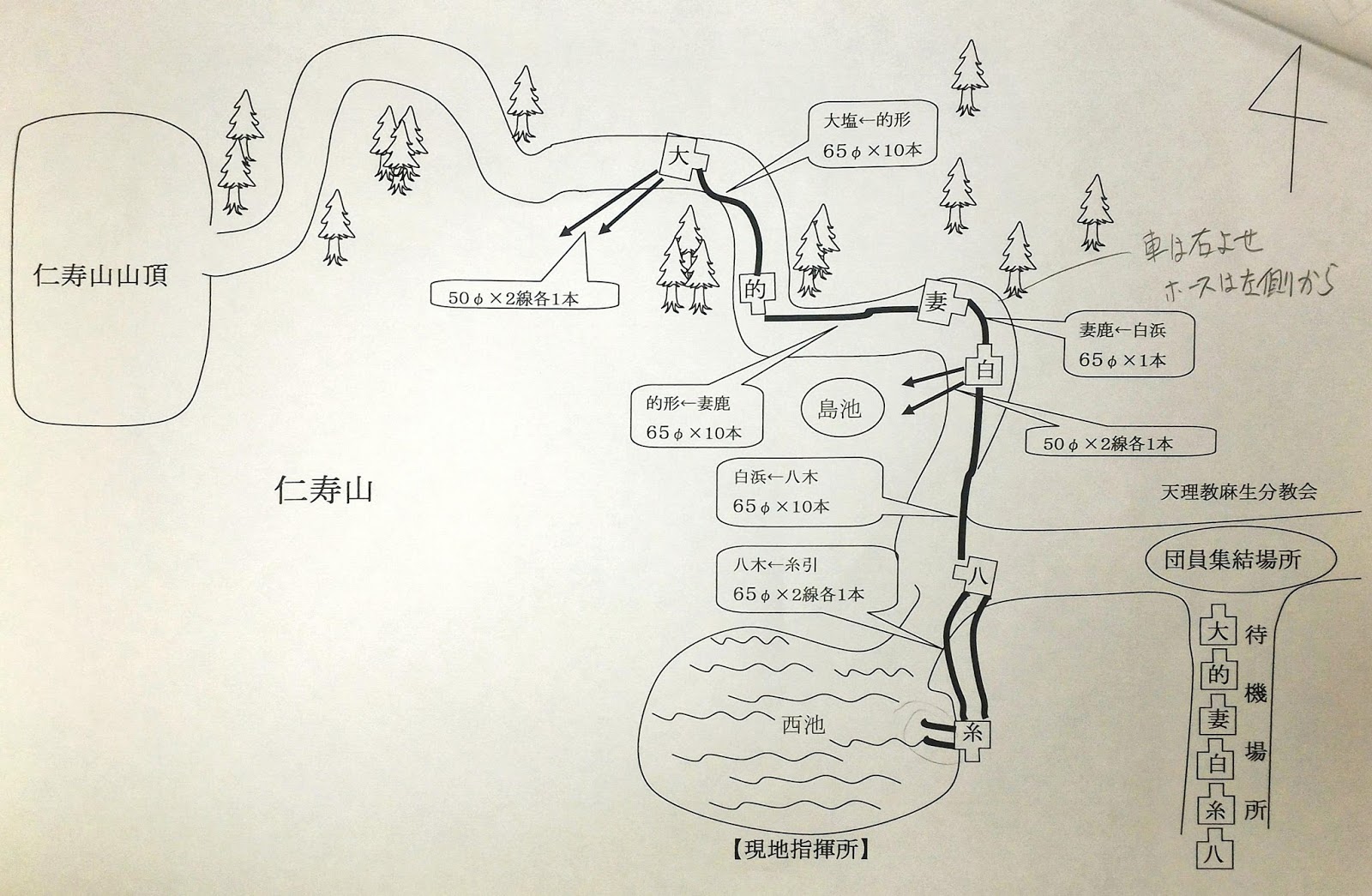 - 八木分団:糸引分団前方に部署 ⇨ 直列高圧送水体形をとり、白浜分団へ65mm水管1線10本延長 ⇨ 中継送水。